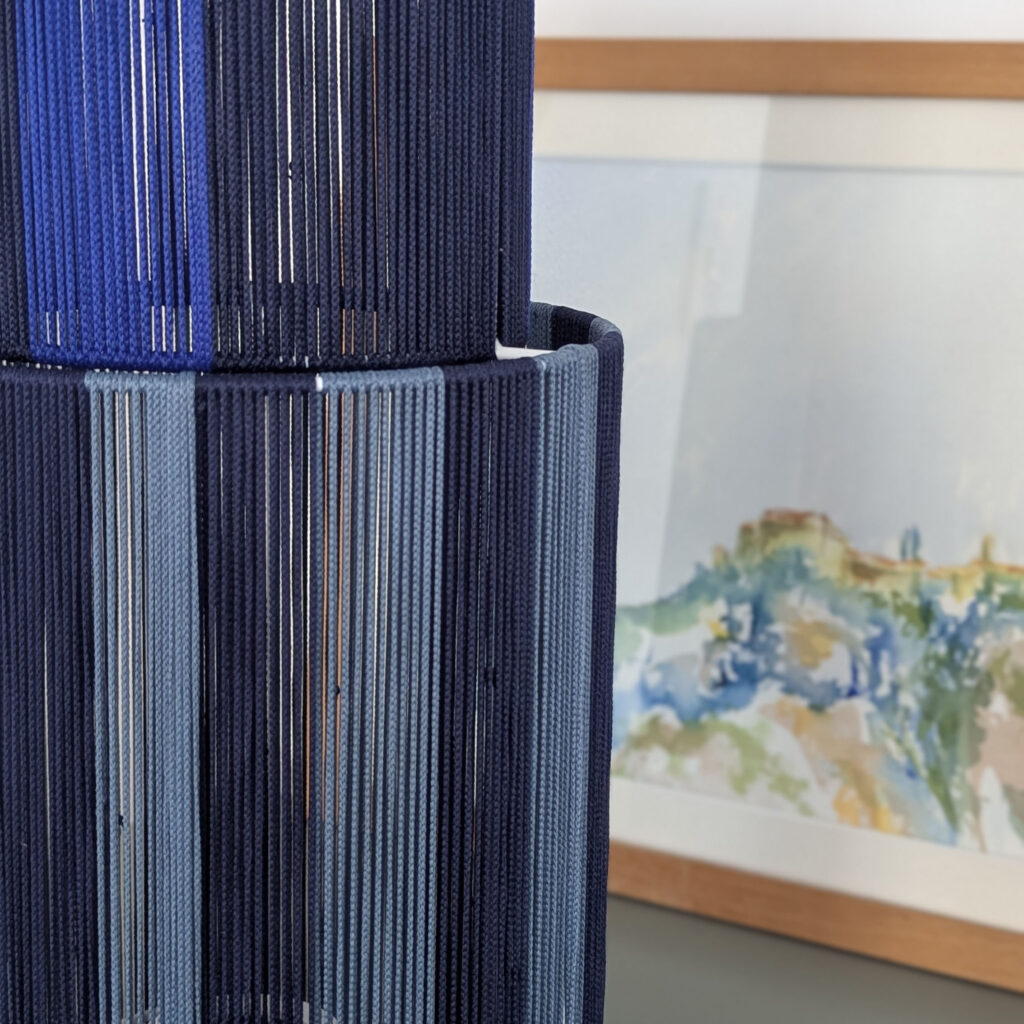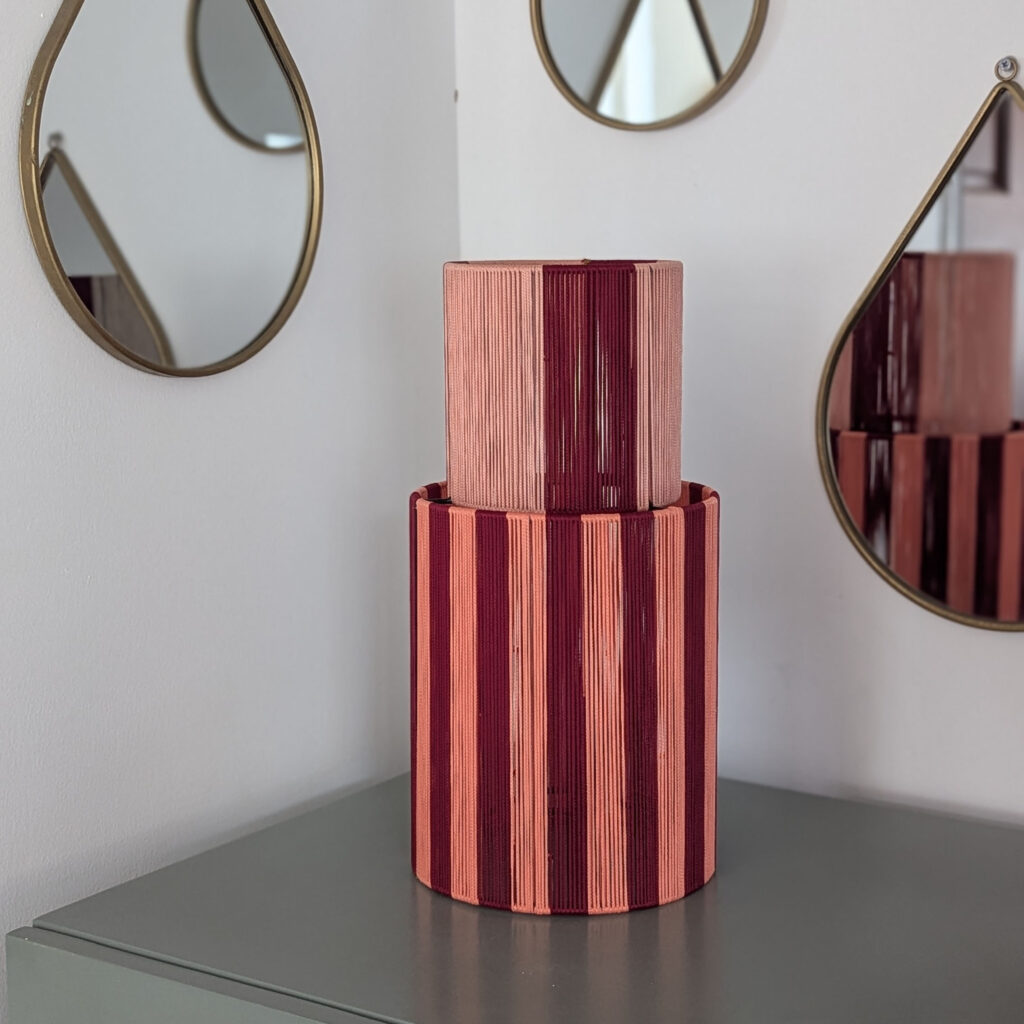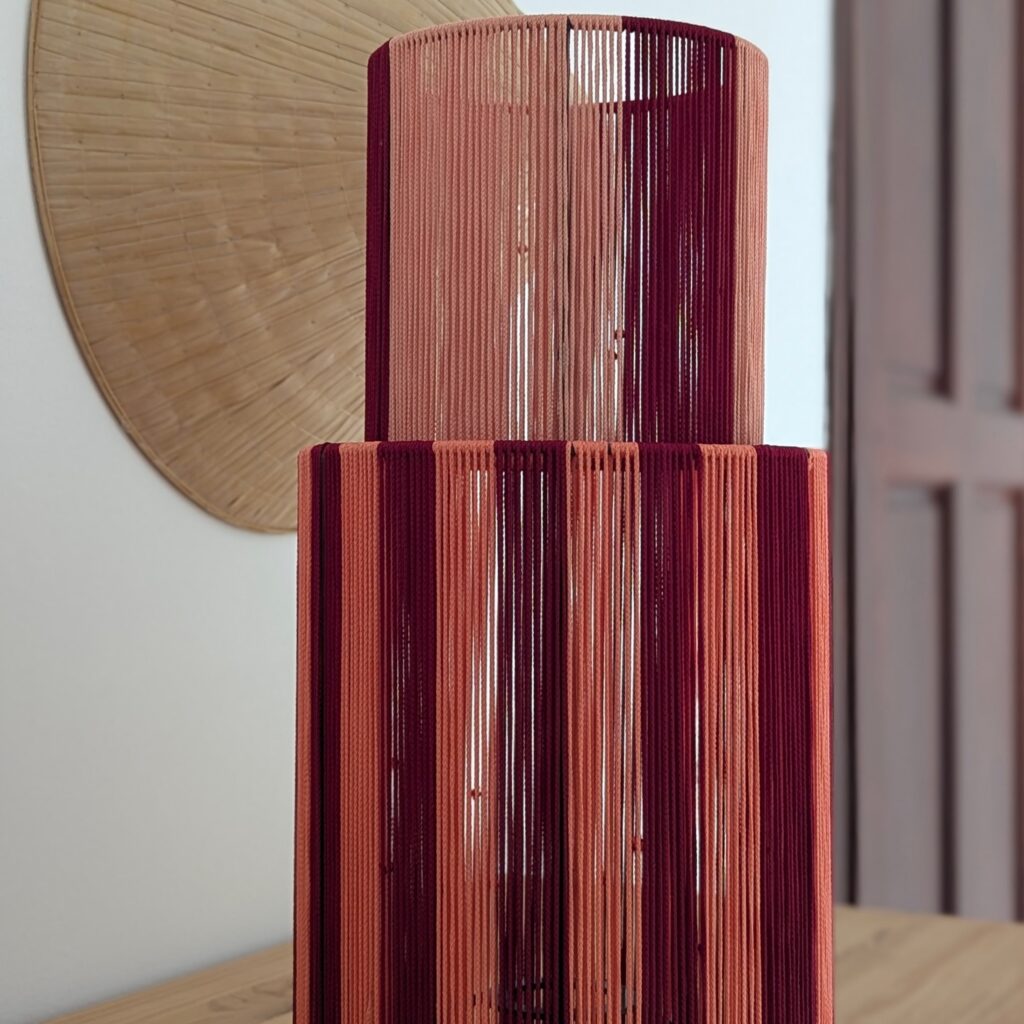 Inspired by the iconic Burj Khalifa, the Dubai Lamp is handcrafted in Vietnam by skilled artisans.Its long and delicate satin cord weaving rises vertically, reflecting light in a luminous and sculptural way.Vibrant colors and refined craftsmanship create a bold statement piece, designed to elevate any interior.Each lamp is handmade and fully customizable in colors.